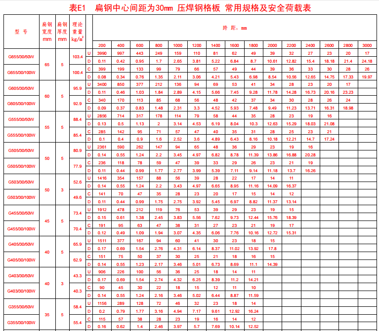 附錄表E.1 承載扁鋼,中心間距為30mm壓焊鋼格板。