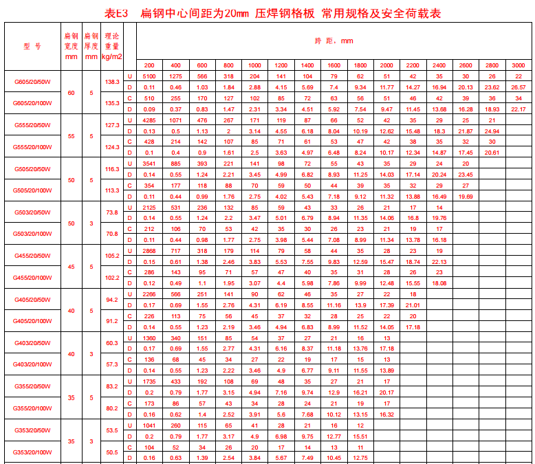 附錄表E.3 承載扁鋼,中心間距為20mm壓焊鋼格板。