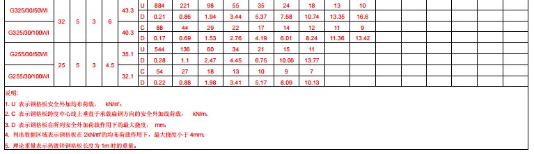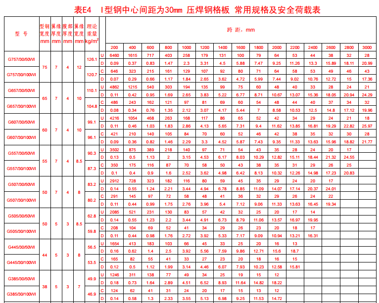 附錄表E.4 承載扁鋼為Ⅰ型鋼,中心間距為30mm壓焊鋼格板。