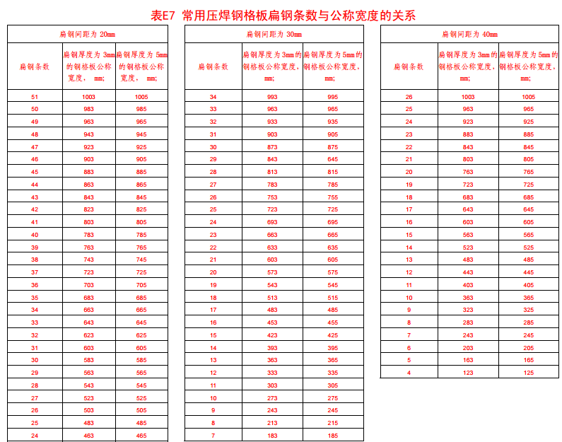 附錄表E.7 常用鋼格板扁鋼條數(shù)與公稱寬度的關(guān)系。